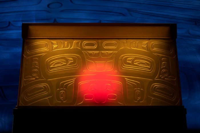 Visitors will be immersed in Tlingit culture through a dynamic, multi-sensory environment. Art objects and exhibition text are supported by audio and video elements. This includes recordings by storytellers, music, Pacific Northwest coastal sounds, and a backdrop of shadows and projected images.